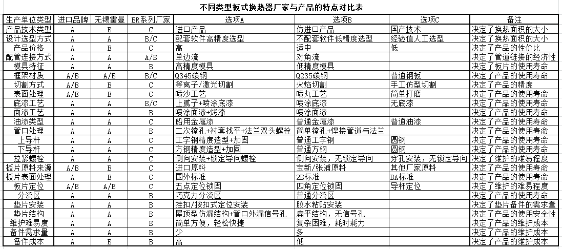 誤區(qū)五:拿著甲換熱器廠(chǎng)家的設(shè)計(jì)方案與圖紙或者是產(chǎn)品要求乙換熱器廠(chǎng)家進(jìn)行報(bào)價(jià)。出于比價(jià)的目的,很多客戶(hù)都會(huì)拿著某一家換熱器廠(chǎng)家的產(chǎn)品設(shè)計(jì)方案、圖紙、產(chǎn)品數(shù)據(jù)甚至僅僅是一個(gè)產(chǎn)品型號(hào)就要求另外的廠(chǎng)家進(jìn)行報(bào)價(jià),有時(shí)候還會(huì)要求比價(jià)單位提供的產(chǎn)品的尺寸、換熱面積必須和其他單位完全一致。實(shí)際上,由于每個(gè)換熱器生產(chǎn)廠(chǎng)家的生產(chǎn)與營(yíng)銷(xiāo)定位、產(chǎn)品板型來(lái)源、產(chǎn)品規(guī)格性能、產(chǎn)品命名規(guī)則、設(shè)計(jì)選型能力、生產(chǎn)制造的能力、推薦習(xí)慣等眾多因素不可能完全一致,就已經(jīng)決定了相同的換熱器設(shè)計(jì)工藝工況不可能出現(xiàn)完全一樣的產(chǎn)品設(shè)計(jì)方案,產(chǎn)品價(jià)格也受產(chǎn)品用料、產(chǎn)品制造工藝、營(yíng)銷(xiāo)理念、報(bào)價(jià)人員的慣性思維模式各種因素的影響而會(huì)出現(xiàn)較大的差別。比如仿阿法拉伐的產(chǎn)品與仿GEA的產(chǎn)品在產(chǎn)品型號(hào)規(guī)格上就會(huì)出現(xiàn)巨大的不同,仿進(jìn)口品牌的產(chǎn)品與老舊板型的產(chǎn)品在換熱面積上也會(huì)出現(xiàn)巨大的差異。同樣類(lèi)型產(chǎn)品廠(chǎng)家的同樣換熱面積的產(chǎn)品,板片厚度0.5mm與0.6mm的產(chǎn)品就會(huì)存在差異,拉緊螺栓帶鎖定導(dǎo)向裝置與不帶鎖定導(dǎo)向裝置的產(chǎn)品價(jià)格也有差異,框架結(jié)構(gòu)采用噴漆工藝與烤漆工藝的產(chǎn)品價(jià)格也不可能進(jìn)行價(jià)格比較。板式換熱器作為一種非標(biāo)設(shè)備,除非生產(chǎn)的產(chǎn)品板型來(lái)源一致、生產(chǎn)的產(chǎn)品規(guī)格數(shù)據(jù)一致、產(chǎn)品用料一致,生產(chǎn)工藝一致,設(shè)計(jì)軟件一致,比如采用仿進(jìn)口品牌產(chǎn)品的廠(chǎng)家的產(chǎn)品可以與其仿制的進(jìn)口品牌的產(chǎn)品進(jìn)行產(chǎn)品互換和價(jià)格比較。否則任何生產(chǎn)單位都不可能按照其他單位的產(chǎn)品規(guī)格與數(shù)據(jù)進(jìn)行產(chǎn)品型號(hào)的確定和進(jìn)行產(chǎn)品報(bào)價(jià)。而且,很多時(shí)候換熱器生產(chǎn)廠(chǎng)家在設(shè)計(jì)方案中都會(huì)刻意不去體現(xiàn)板型特征與板片組合方式,其他單位僅憑已知的資料,有時(shí)候很難判斷板型和板片組裝方式這一至關(guān)重要的產(chǎn)品數(shù)據(jù),只能憑借經(jīng)驗(yàn)去判斷,很容易因判斷者的個(gè)人經(jīng)驗(yàn)原因而產(chǎn)生錯(cuò)誤。因此,明智和正確的做法應(yīng)該是采購(gòu)者提出準(zhǔn)確的產(chǎn)品技術(shù)標(biāo)準(zhǔn)要求,提出統(tǒng)一的設(shè)計(jì)工況數(shù)據(jù),讓換熱器廠(chǎng)家自行選型和報(bào)價(jià)并提供詳細(xì)的設(shè)計(jì)方案與圖紙以及產(chǎn)品的優(yōu)勢(shì)制造工藝特點(diǎn),采購(gòu)者通過(guò)這些資料對(duì)報(bào)價(jià)單位的產(chǎn)品類(lèi)型和特點(diǎn)進(jìn)行分類(lèi),相同類(lèi)型的單位,相同檔次的產(chǎn)品才可以進(jìn)行比較和評(píng)判。很簡(jiǎn)單的舉例,任何的產(chǎn)品都會(huì)有高中低檔的差別,他們的性能和售價(jià)會(huì)存在巨大的差別,拿桑塔納去和奇瑞QQ比價(jià)格,或者拿桑塔納去和奔馳GLK比性能,肯定都是沒(méi)辦法比的。我們推薦采用產(chǎn)品技術(shù)特征對(duì)比表格的方式來(lái)對(duì)板式換熱器的生產(chǎn)廠(chǎng)家和產(chǎn)品進(jìn)行綜合評(píng)判(見(jiàn)附件表格,僅供參考)